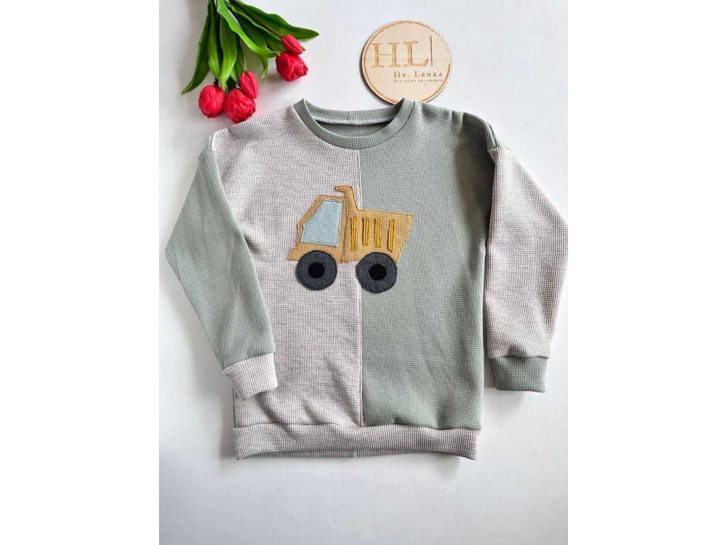 Vaflová mikina střihu oversize s dělením, v barvách PISTÁCIE a NUDE MELÍRU, s aplikací žlutého náklaďáku
